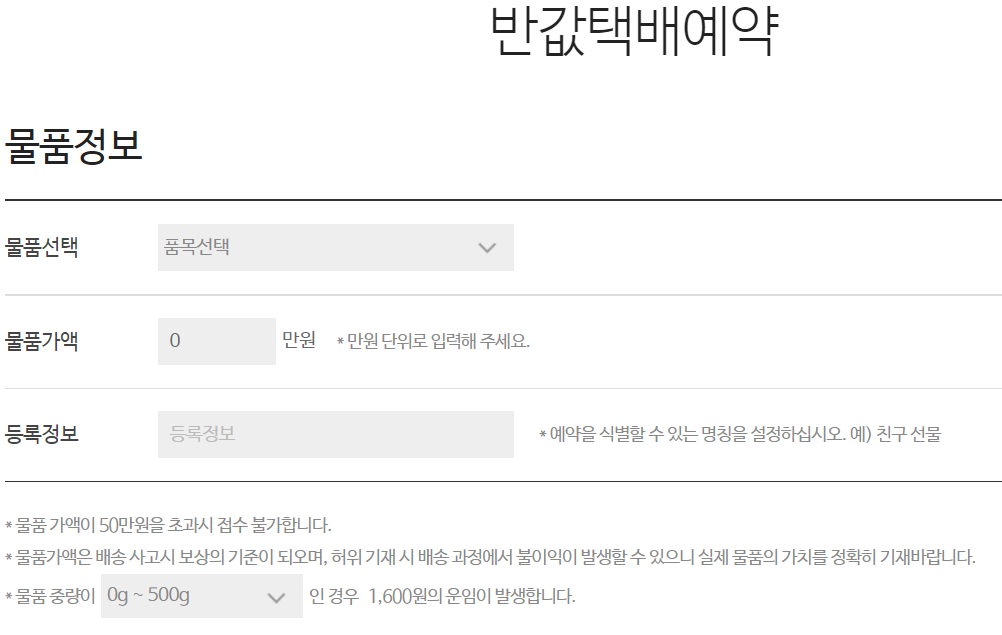 - 물품가액 50만원이상의 고가상품 접수 불가