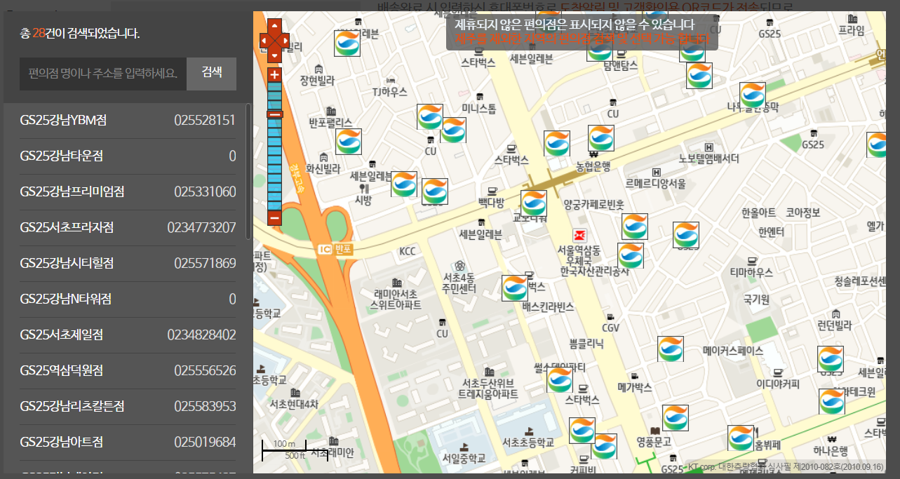 도착 편의점 검색을 위해 "편의점 검색" 버튼을 눌러보면 아래와 같은 지도창이 팝업되고 본인이 보내야 할 GS25 편의점을 검색 후 선택하면 도착 편의점으로 설정되요. 그리고 예약을 완료합니다.