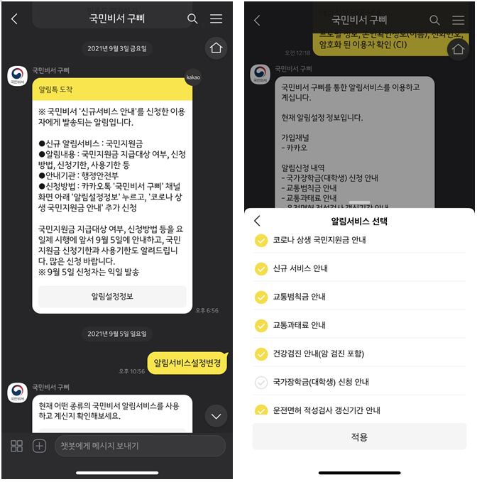 국민비서가 제공하는 선제적 알림서비스를 받기 위해서는 개인 핸드폰에 설치된 앱을 통해 가능합니다. 국민비서는 네이버, 카카오톡, 그리고 토스 앱을 통해 알림서비스를 제공하고 있으므로 본인 핸드폰에서 자주 사용하는 앱을 골라 신청할 수 있습니다. 참고로 저는 카카오톡 앱을 이용해 지난 8.18에 신청을 하였었고 9.3에 국민지원금 관련 지급대상 여부, 신청방법, 신청기한, 사용기한 등에 대한 알림을 제공한다는 메시지를 받을 수 있었습니다.