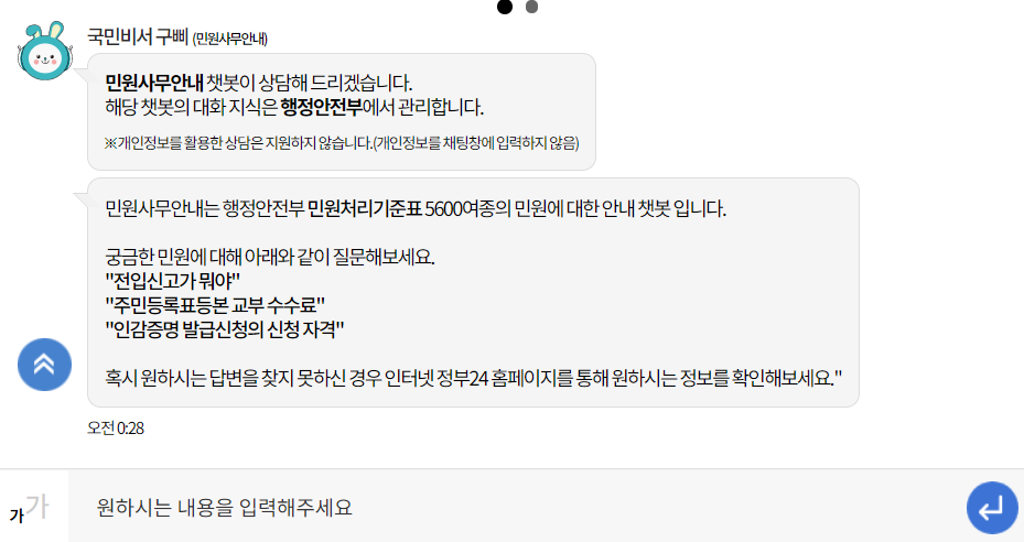 24시간 채팅으로 민원사무 등 행정업무 11가지 분야에 대한 상담을 제공하는 서비스입니다. 상담서비스는 인터넷 국민비서 홈페이지에서만 가능하며 메신저로 채팅을 하는 방식으로 서비스를 제공하고 있습니다.