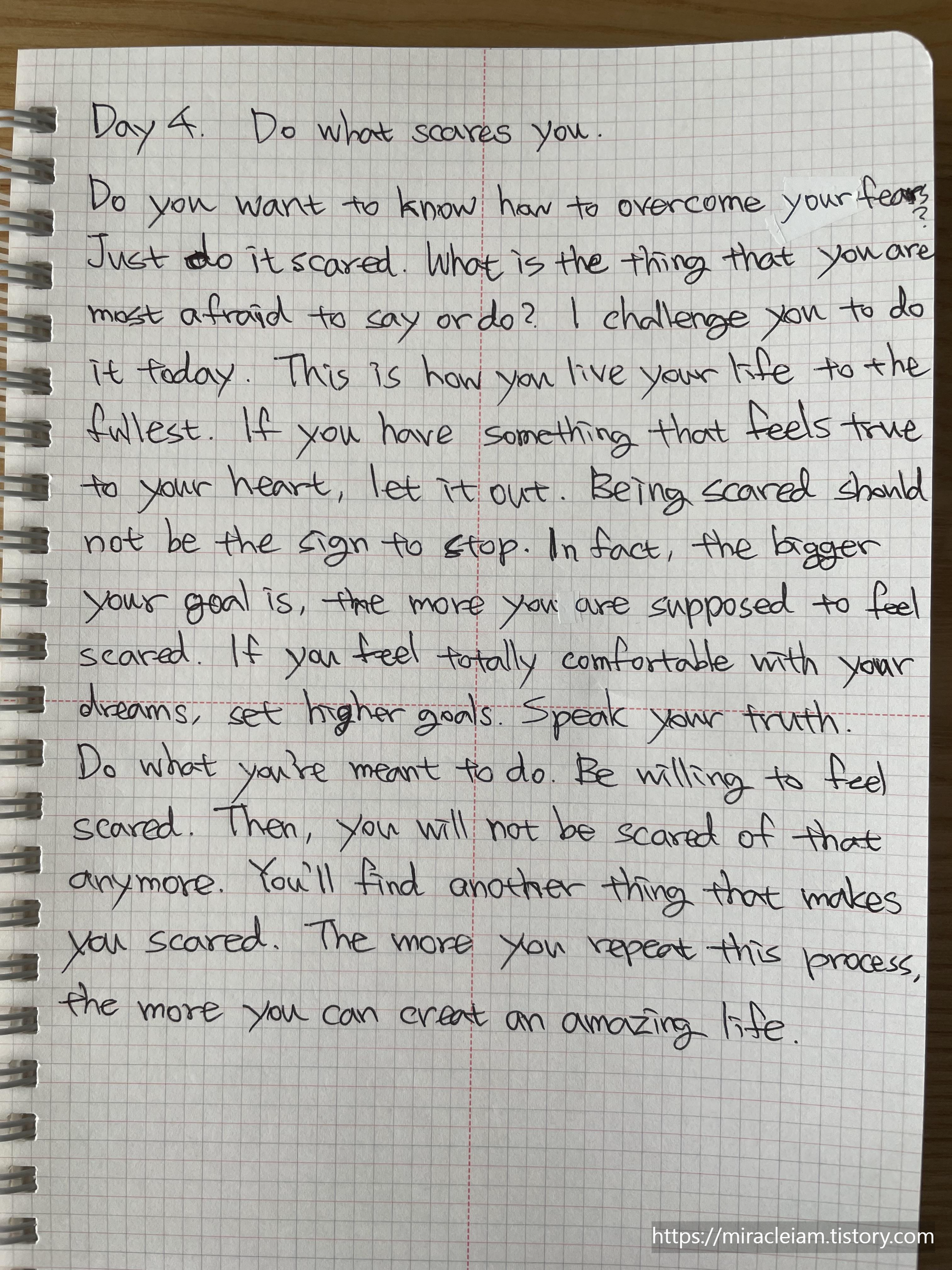 두려움을 극복하는 방법을 알고 싶으신가요? 하려던 일을 두려운 채로 그냥 하세요. 말하거나 행동하기에 가장 두려워하는 것이 무엇인가요? 그 말과 행동을 오늘 바로 해 보세요. 그것이 당신의 인생을 최대한 즐기며 사는 방법이에요. 당신의 마음 안에 진실하게 느껴지는 게 있다면, 이제 밖으로 꺼내 보세요. 두렵다는 느낌을 그 일을 하지 말아야 할 신호로 받아들이면 안 됩니다. 사실, 목표가 높을수록 내 마음에서 느껴지는 두려움이 커지는 것은 당연합니다. 만일 여러분의 목표에 대해 생각할 때 완전히 편안한 느낌만 든다면, 더 높은 목표를 가져야 합니다. 여러분만의 목소리를 내세요. 스스로 원하는 일들을 해 보세요. 기꺼이 두려움을 받아들이세요. 그러면 그것들이 더는 두렵지 않을 거예요. 당신을 두렵게 만드는 다른 것을 발견하게 될 것입니다. 이 과정을 반복할수록, 여러분의 인생은 놀라운 일들로 가득 차게 될 것입니다.