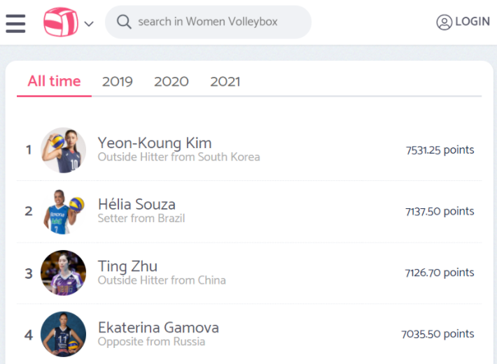 김연경 선수는 women.vollyballbox.com에 따르면 세계 여자배구선수 랭킹에서 올타임 세계랭킹 1위에 랭크되어 있습니다. 2위와 3위 선수가 근소한 차이로 경쟁하고 있지만 김연경 선수와 2위 선수간 점수차는 그 보다 훨씬 더 차이를 두고 있습니다.