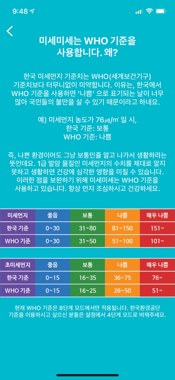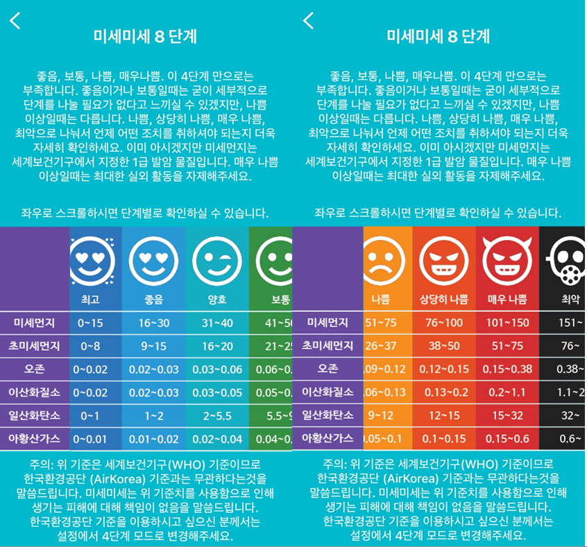 그리고 미세미세는 WHO(세계보건기구) 기준을 따라 미세먼지 나쁨의 정도를 표현하고 있어요.
