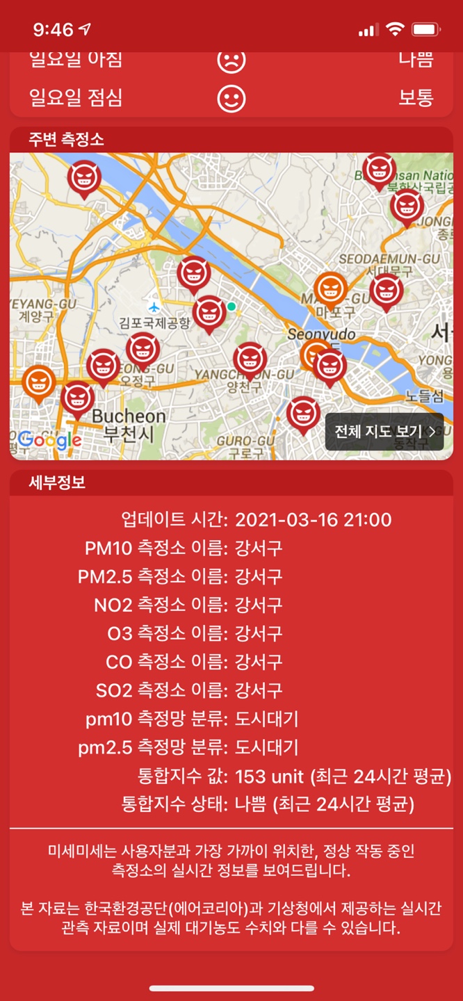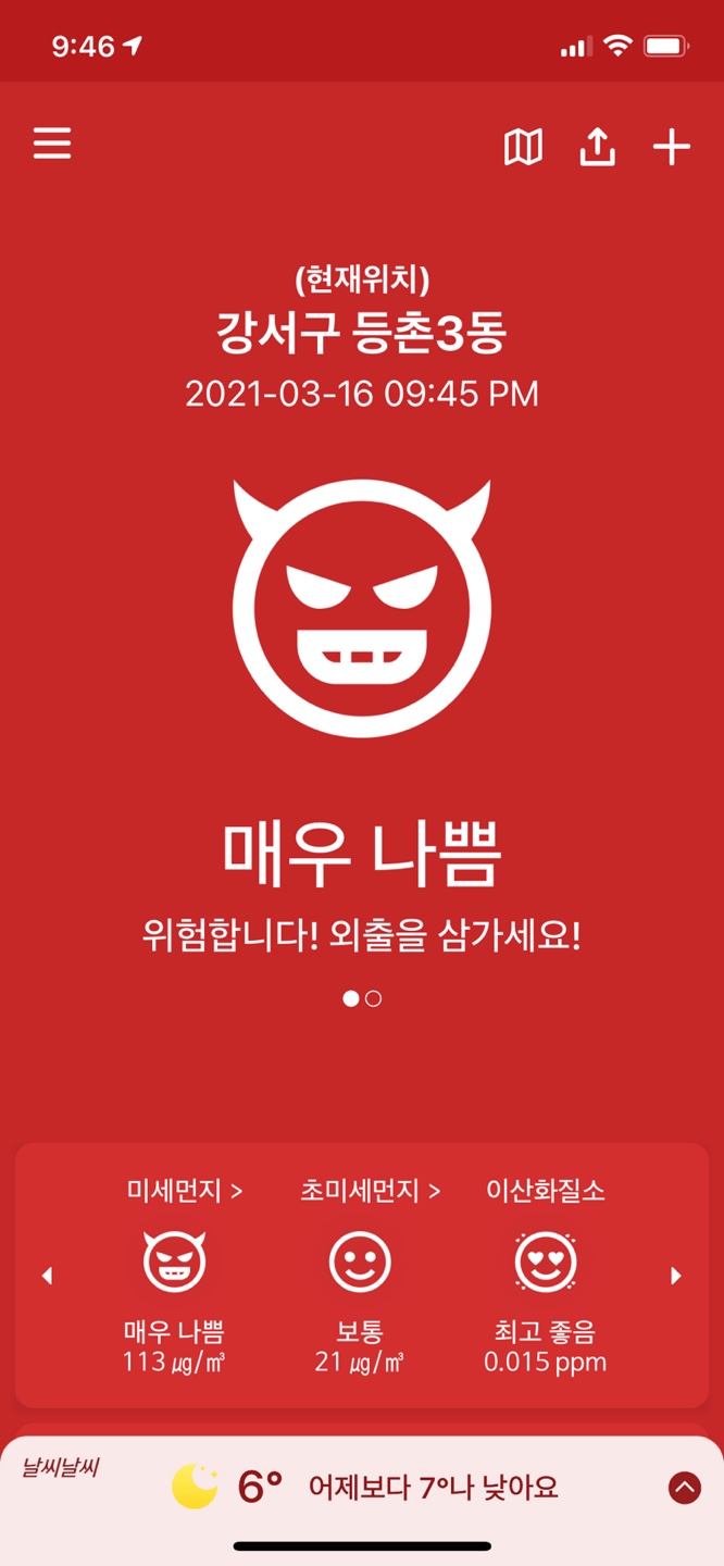 - 현재 위치 기준 미세먼지 나쁨 정도를 이미지와 단계명으로 표시하여 알려주며 권고 행동요령을 안내해 줍니다. 또한 대기 종류별 나쁨 정도 구분하여 표기해 주고 있어요.