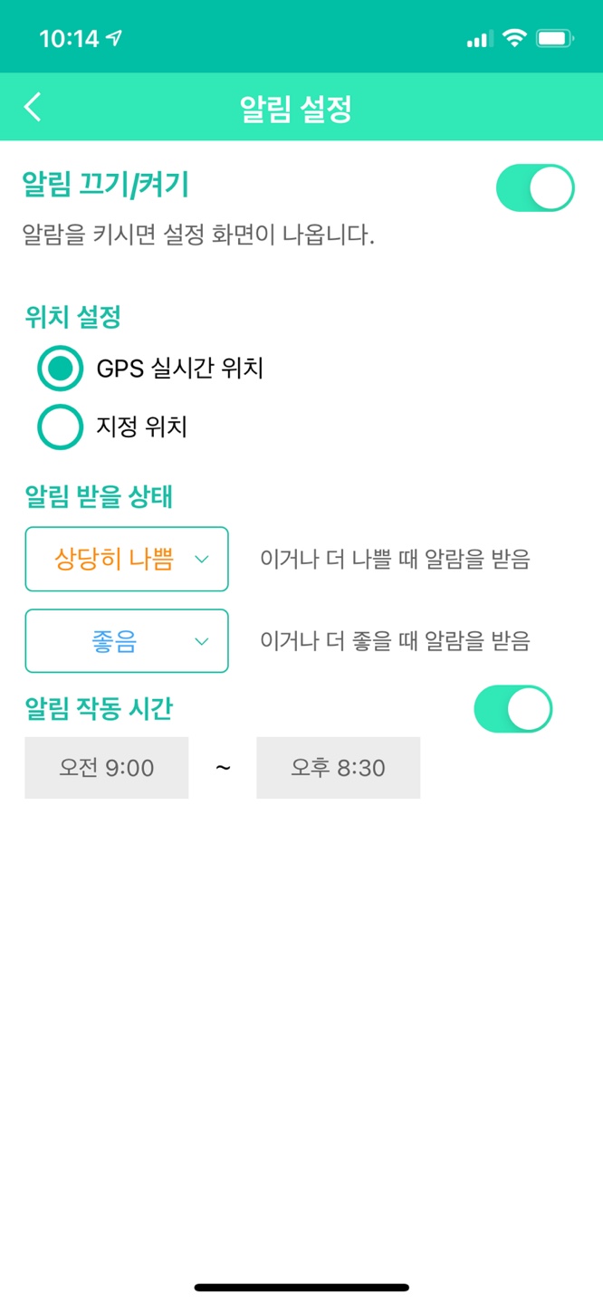 미세먼지 나쁨 정도가 심할경우 또는 좋을경우를 설정하여 알림을 받을 수 있습니다. 그래서 가족들과 혹은 개인 업무에 집중하다가 미세먼지 정보를 받고 다음 일정을 유연하게 조정할 수 있습니다.