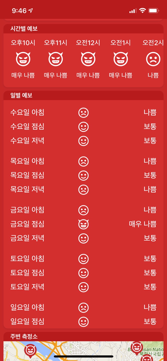 일별 예보(요일별 아침, 점심, 저녁으로 구분하여 표기됨), 장소별 현재 미세먼지 나쁨 정도