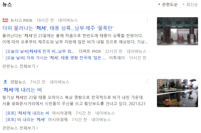 어제(8월 23일)는 태풍 오마이스의 영향으로 전국에 비가 내렸던 하루였습니다. 공교롭게도 태풍 소식을 전하는 뉴스와 함께 자주 접할 수 있었던 단어가 바로 "처서" 였는데요 그래서 오늘은 처서에 대해 소개해 드리겠습니다.