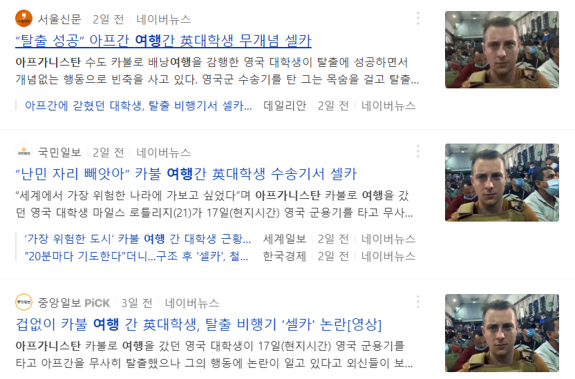 영국인 대학생 마일스 로틀리지는 자신의 페이스북 계정에 “나는 두바이에 안전하게 도착했다. 영국군에 감사하다”는 글과 함께 몰래 찍은 셀카 영상을 올렸다가 개념 없는 행동으로 빈축을 사고 있다고 BBC가 보도했습니다. 영국 정부는 아프간에 대해 ‘필수 목적을 제외한 여행 자제 권고’를 내리고 있지만 마일스는 졸업 전 ‘가장 위험한 도시’를 검색한 후 카불을 여행지로 정했기 때문입니다. 그의 페이스북에는 "이 상황에서 셀카 찍어 올리다니 개념이 없다. 당신이 탄 그 수송기 좌석은 다른 여성이나 아이가 탈 수도 있는 자리였다. 당신이 한 생명의 목숨을 빼앗았을 수도 있다."라고 질타하는 댓글이 달렸습니다.