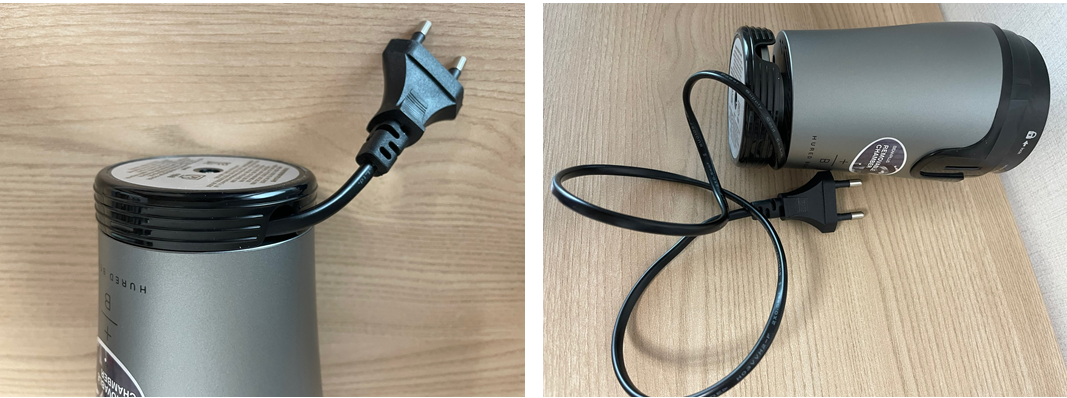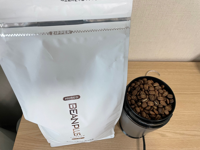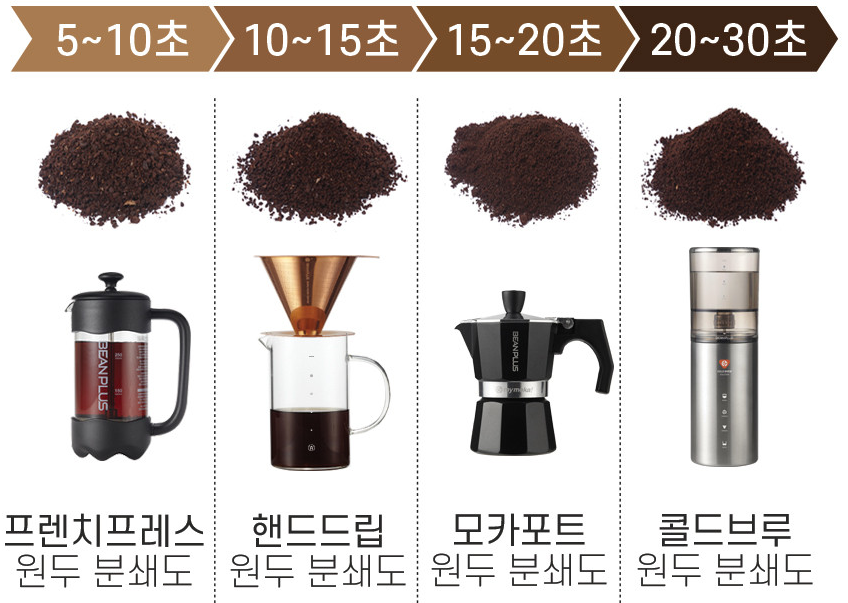 원두를 그라인더에 담았으면 전원 케이블을 꼽고 버튼을 눌러 약 20-30초간 갈아줍니다. 원두의 양에 따라 적정 분쇄 시간에 대해 빈플러스에서 안내하는 사항을 참고하시면 됩니다.