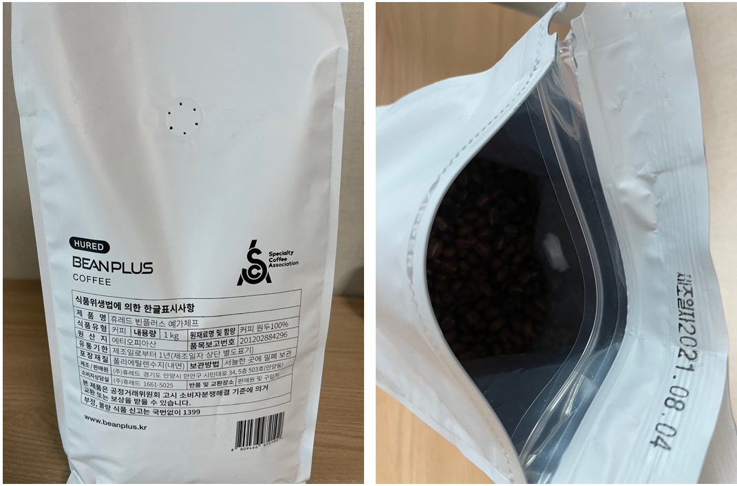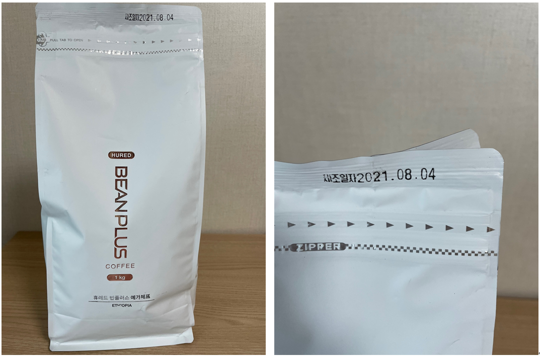 빈플러스에서는 커피 기구를 판매하는 것은 물론 원두커피도 함께 판매하고 있고 가격도 배송비 포함했을 때 가성비가 떨어지지 않아 좋습니다. 저는 에티오피아 예가체프 1kg을 구매하였는데 비닐팩에 담겨서 배송이 되고 제품 상단에 제조일자, 즉 원두를 로스팅한 일자가 표시되어 있습니다.