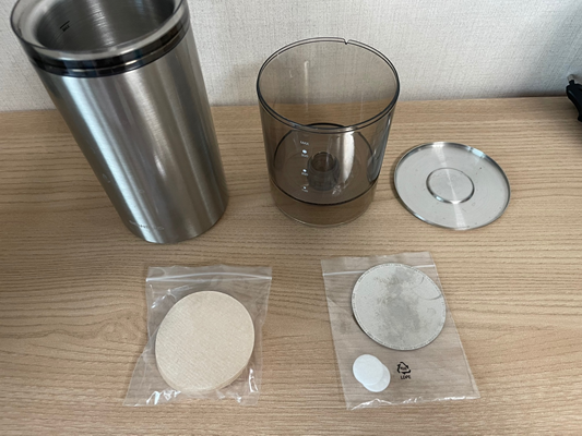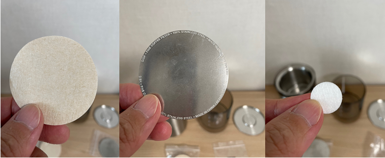 스테인리스 서버를 좌우로 살살 흔들어주면서 원두의 표면 수평을 맞춰 주고 그 위에 여과지를 올려줍니다. 이때 여과지는 위에서 드립하는 물이 원두 전체에 퍼지게 하는 역할을 합니다. 앞으로 오래오래 콜드브루를 내려 마실 계획이라 여과지와 동일한 기능을 하는 스테인레스 여과필터를 추가로 구매해서 사용하고 있습니다.