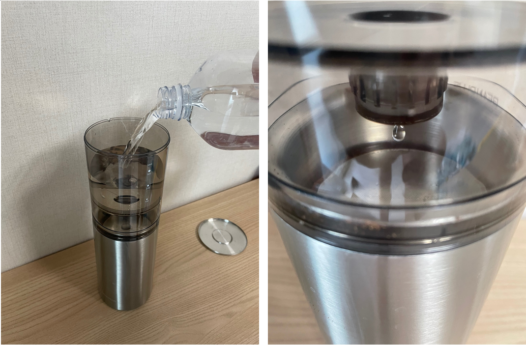 그런 다음 물탱크를 뒤집어서 보면 중앙에 물 조절 밸브가 있는데 여기에 정수필터를 하나 넣어줘서 더욱 깨끗한 물로 콜드브루 할 있습니다.