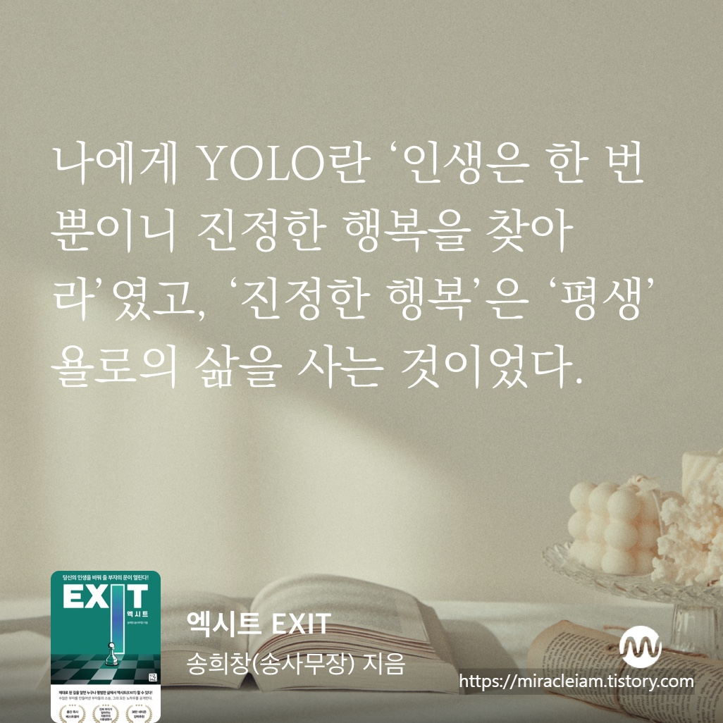 "나에게 YOLO란 '인생은 한 번 뿐이니 진정한 행복을 찾아라'였고, '진정한 행복'은 '평생' 욜로의 삶을 사는 것이었다."