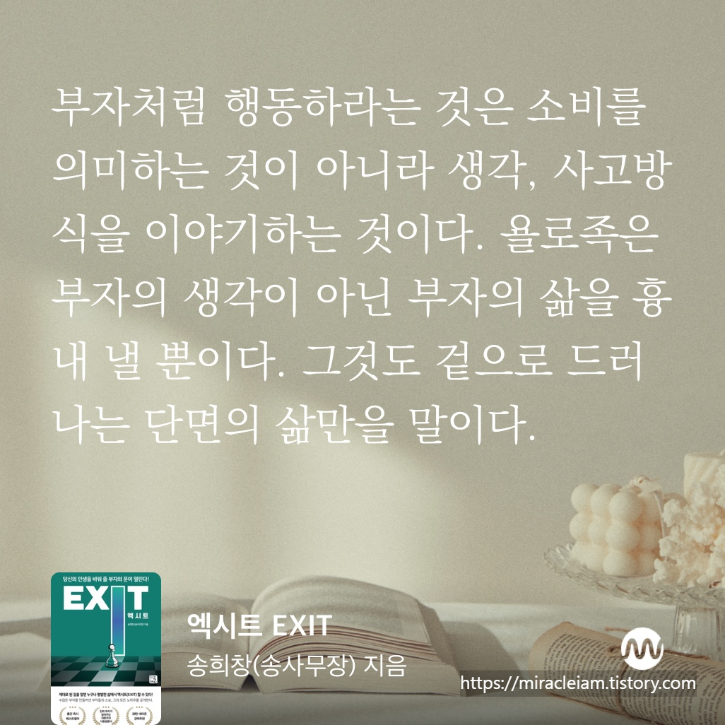 어찌되었건 이런 얘기를 자주 듣다보면 좋은 옷을 사입고 좋은 차를 사서 타고 좋은 가방을 들고 다녀야 부자가 될 수 있다는 식으로 생각의 방향을 이끌고 갈 수 있는데 이것은 틀렸고 그 이유를 명확하게 설명해 주는 내용이 바로 EXIT의 저자 송사무장님의 말로 대신할 수 있다.