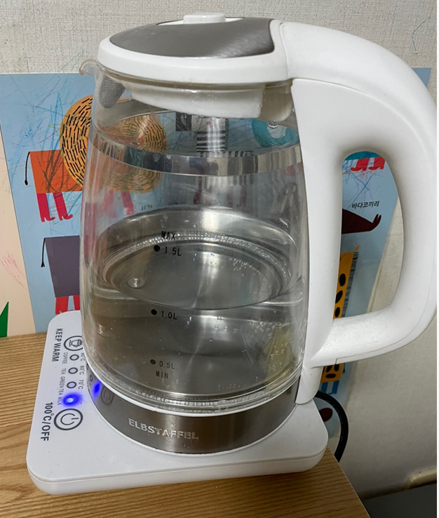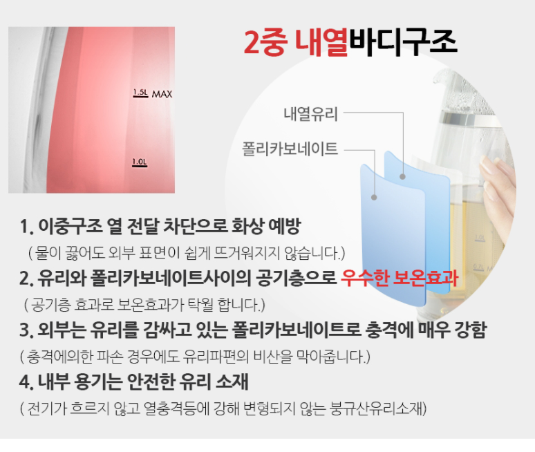 물을 담는 용기는 위생적인 내부 내열강화 유리재질과 외부충격에 강한 폴리카보네이트 재질의 2중구조로 되어 있어 뛰어난 내구성과 열전달 차단 기능으로 화상이 위험이 적고 보온력이 탁월하다는 것에 그대로 마음이 가버렸어요.