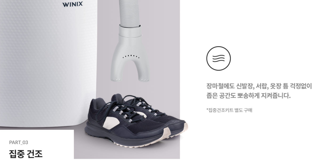 그리고 추천하고 싶은 기능 또 하나! 신발 건조 기능입니다. 집중건조키트라고 하는 호스관과 Y자 관을 활용하는 방법인데, 호스관을 제습기 본체와 결합하고 호스관의 다른 쪽 끝을 Y자 관에 결합을 합니다.