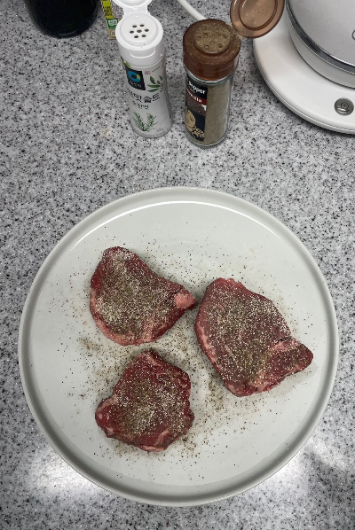 ㅇ고기에 소금과 후추를 넉넉히 뿌려줍니다. 그리고 오일을 고기에 적당히 버무릴 수 있을 정도로 두른 후 장갑낀 손으로 소금, 후추랑 잘 어우러지게 해줍니다.