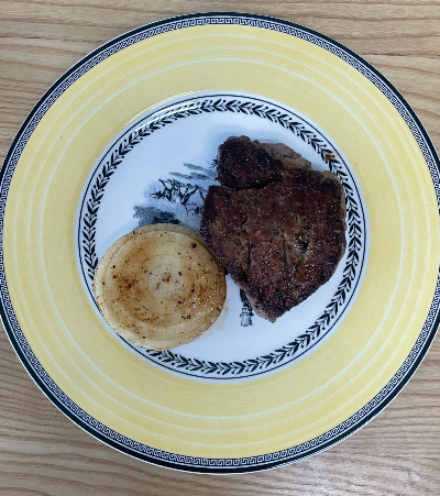 ㅇ 레스팅에 사용했던 호일을 벗기고 안심 스테이크를 꺼내 이쁜 접시에 놓습니다. 그리고 가니쉬한 양파도 올려 놓으면 완성입니다.