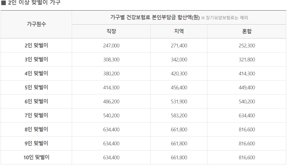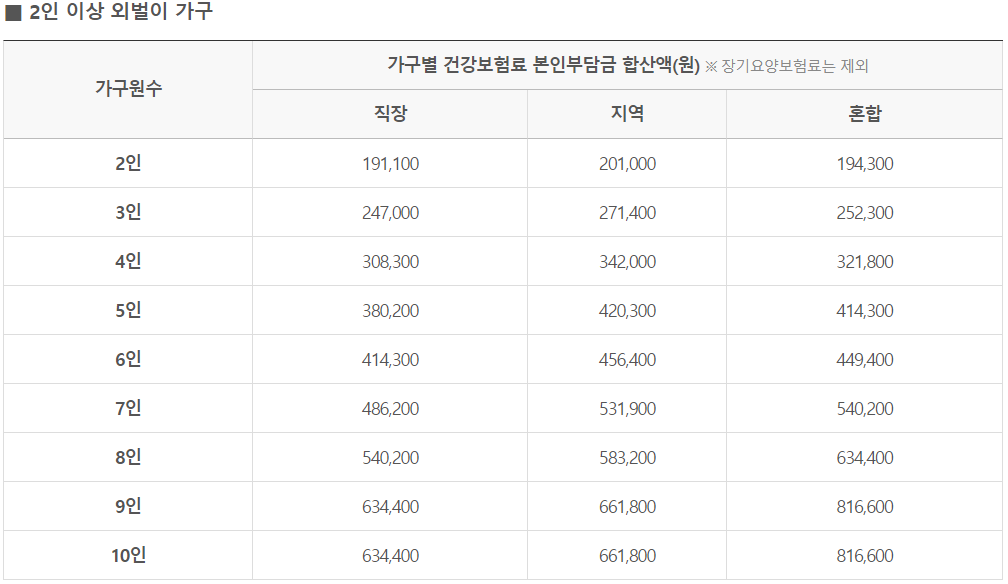 1) 2인 : 직장 191,100원, 지역 201,000원, 혼합 194,300원 이하