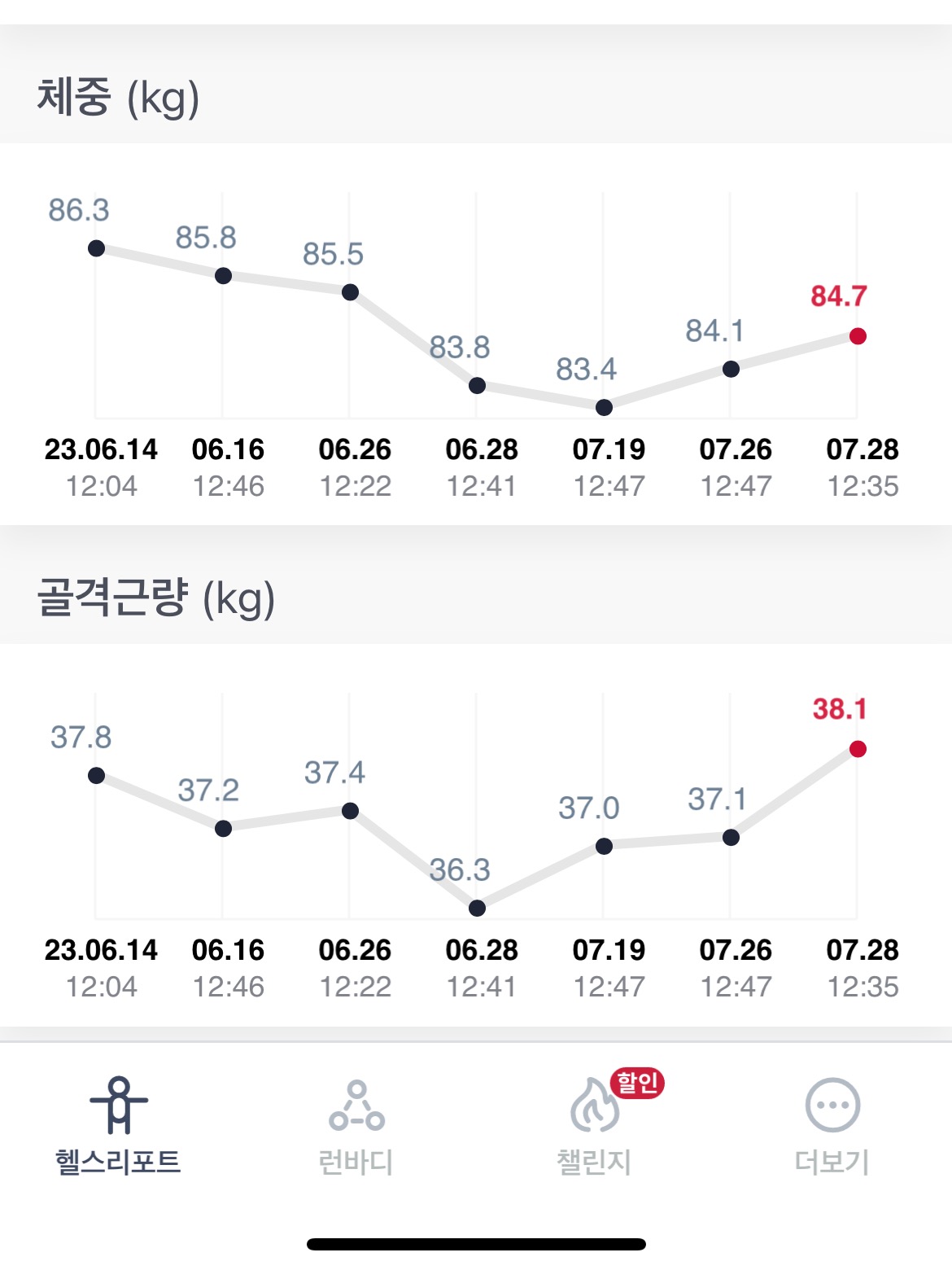 - 올해 1월에는 92키로였는데 계단 오르기, 달리기, 걷기, 실내자전거 타기 등을 번갈아가며 해왔다. 7월 현재 몸무게는 84.7킬로이다. 헬스장에 인바디가 있어서 6월부터 체크를 했었는데 6월에는 86.3킬로였고 가장 많이 몸무게를 줄인 날은 7월 19일이었다. (83.4킬로)
