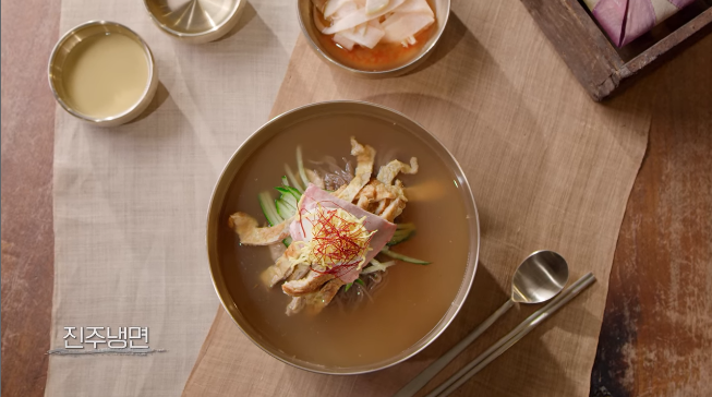 - 평양이 북쪽에서 상업의 메카였다면 남쪽에서는 예술과 교류의 중심지인 진주였고 교방문화가 발달했다는 특징으로 평양과 진주는 공통점이 있다고 합니다. 야심한 밤에 출출하다보니 냉면집을 찾게 되었고 그래서 냉면은 사실 야참 음식이었다고도 합니다. 선주후면(먼저 술을 즐기고 속풀이로 국수를 먹는다는 뜻)도 기생문화와도 연관이 있다고 볼 수 있습니다. 진주문화가 선비문화고 풍류가 있어서 그리고 교방음식이다 보니 올라가는 고명이 화려하다는 점입니다. 마치 한폭의 그림 같은 느낌이라고 표현합니다.
